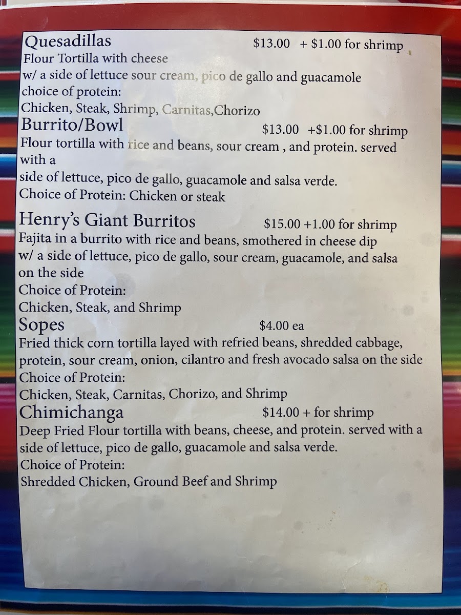 Deep Fried Flour tortilla with beans, cheese, and protein. served with a side of lettuce, pico de gallo, guacamole and salsa verde. Choice of Protein: Shredded Chicken, Ground Beef and Shrimp