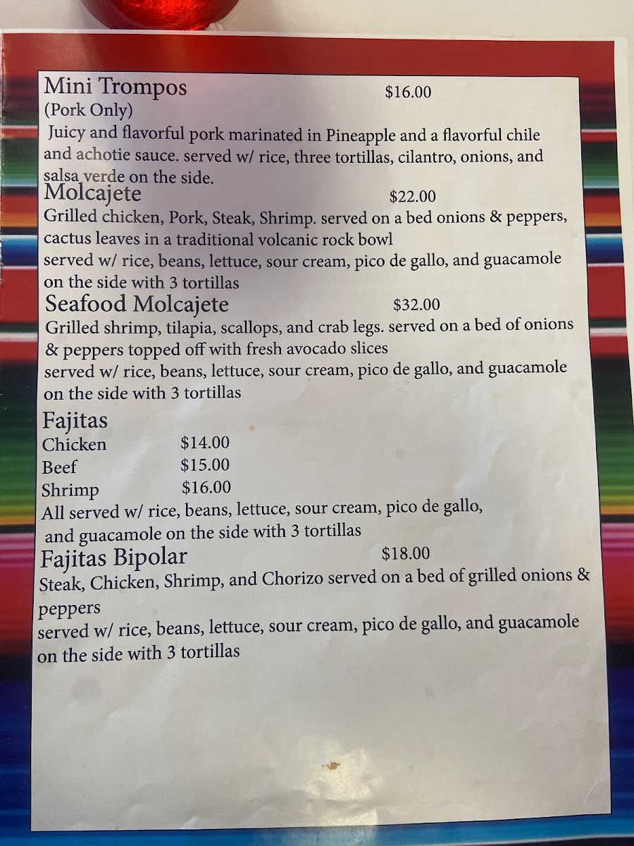 Grilled chicken, Pork, Steak, Shrimp. served on a bed onions & peppers, cactus leaves in a traditional volcanic rock bowl served w/ rice, beans, lettuce, sour cream, pico de gallo, and guacamole on the side with 3 tortillas