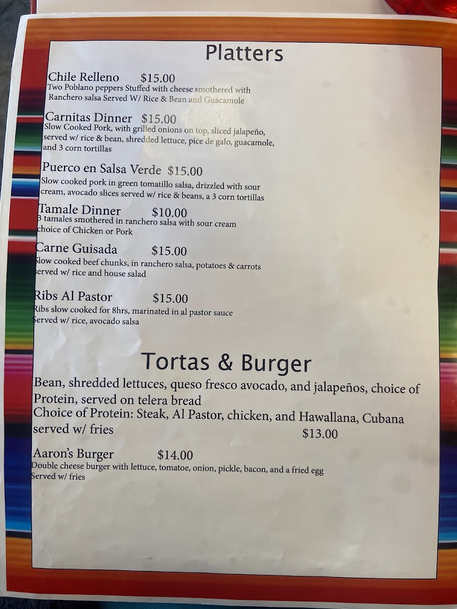 Bean, shredded lettuces, queso fresco avocado, and jalapeños, choice of Protein, served on telera bread Choice of Protein: Steak, Al Pastor, chicken, and Hawallana, Cubana served w/ fries